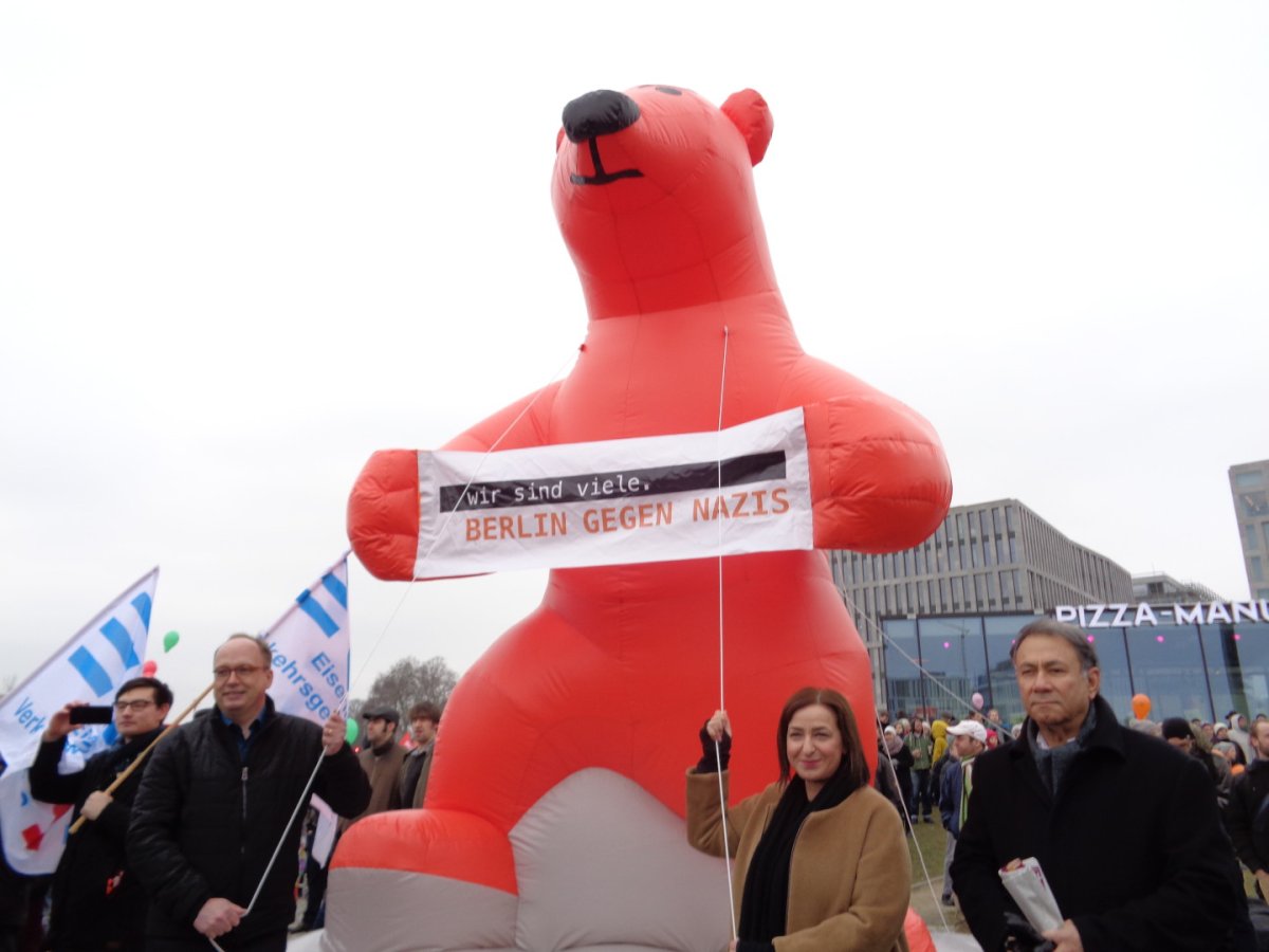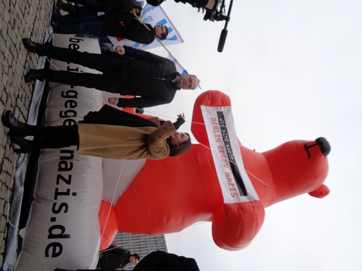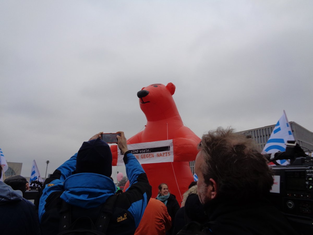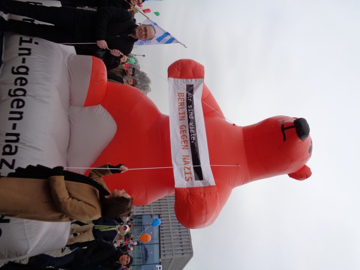 Nicht nur vielfältig, sondern vier Meter hoch ist ab sofort der Protest gegen Rechtsextreme und Rassist_innen in Berlin. Am Samstag, den 12.3.2016 stellte die berlinweite Mobilisierungsplattform „Berlin gegen Nazis“ ihren überdimensionalen, aufblasbaren Bären der Öffentlichkeit vor. Die Bärenfigur wurde direkt neben der Auftaktkundgebung von „Wir für Berlin & Wir für Deutschland“ am Washingtonplatz am Hauptbahnhof in Berlins Mitte aufgebaut. Der entschlossen dreinschauende Bär hält ein Banner in seinen Tatzen. „Berlin gegen Nazis – Wir sind viele!“ ist darauf zu lesen.