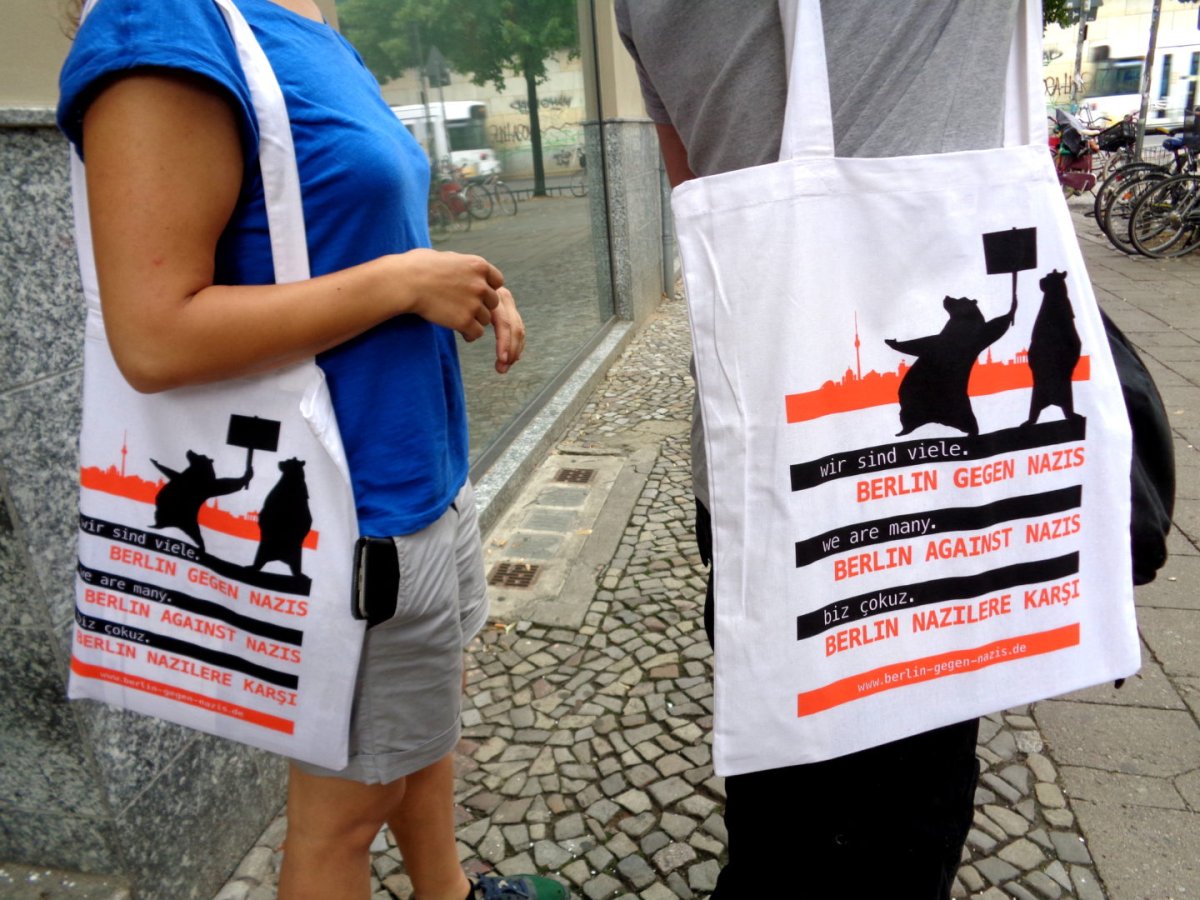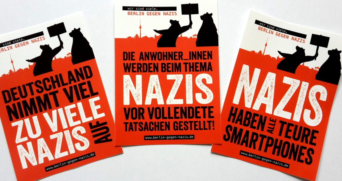 +++ Hinweis: Die Aktion wurde im September 2016 beendet +++ Die Kommunikationsagentur Super an der Spree hat für Berlin gegen Nazis drei neue Sticker sowie einen dreisprachigen Beutel gestaltet. Die Stickerserie zitiert Vorurteile "besorgter Bürger" in ganz eigener Art und Weise und führt sie damit ins Absurde. Sticker und Beutel können ab jetzt bei uns kostenlos bestellt werden, dafür bitte eine Mail mit der Postanschrift an info@berlin-gegen-nazis.de verschicken.
