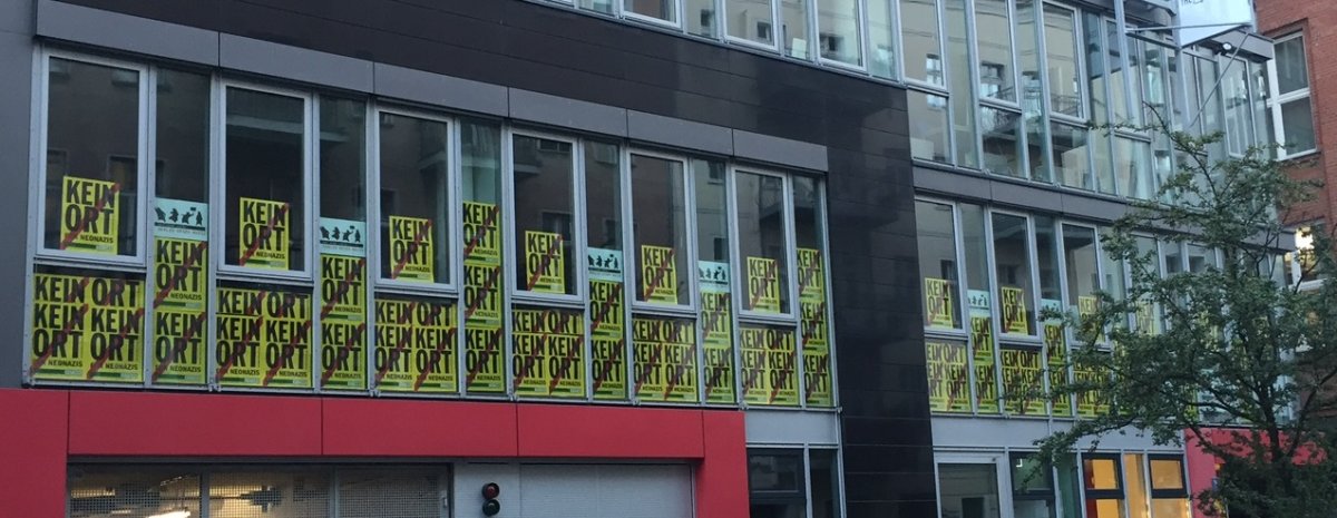 Ein weiteres Ziel von Bärgida sollte die Amadeu Antonio Stiftung sein. Sie engagiert sich seit Jahren gegen Rechtsextremismus, Rassismus und Antisemitismus und hat sich mit einer entsprechenden Umgestaltung der Bürofenster auf den Aufmarsch vorbereitet (Foto: Amadeu Antonio Stiftung):