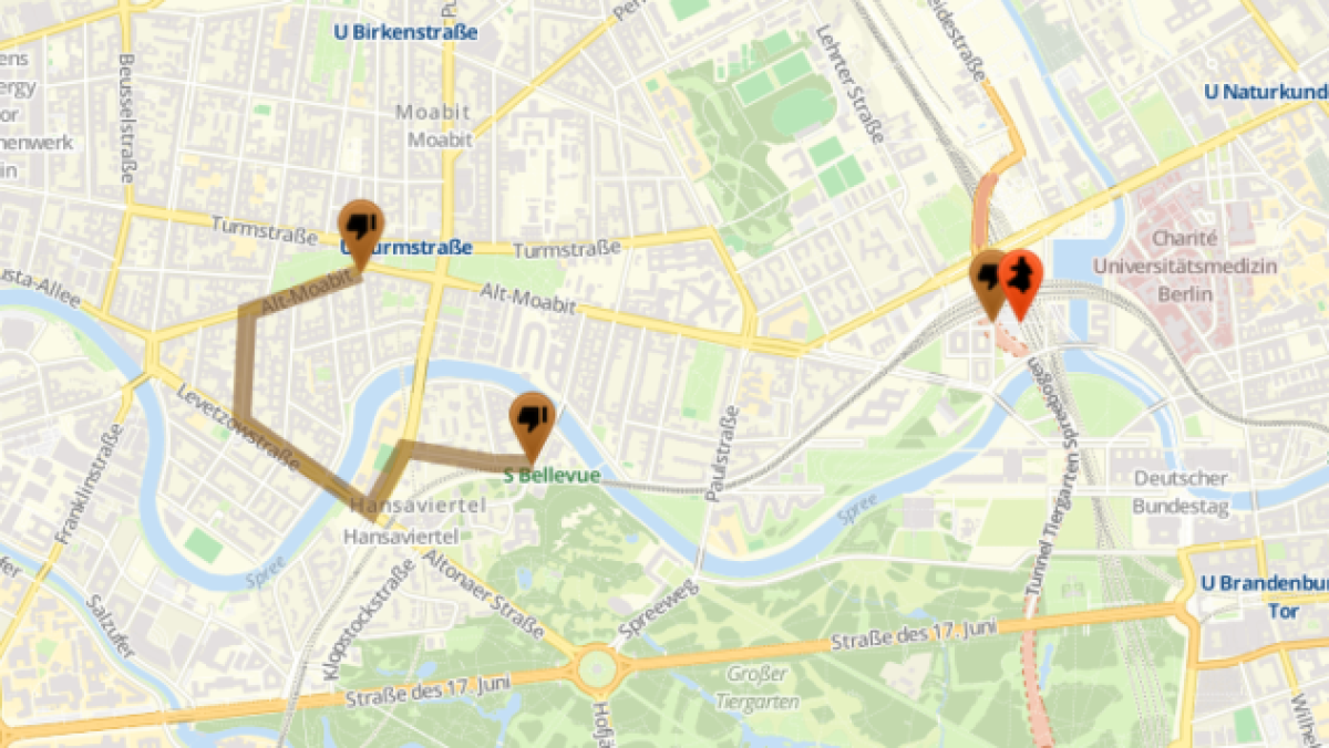 Voraussichtliche Route Bärgida-Aufmarsch ab 20.00 Uhr, Startpunkt: S Bellevue (Nordseite) – Flensburger Straße – Lessingstraße – Levetzowstraße – Jagowstraße – Alt-Moabit – voraussichtliches Ende Alt Moabit/Krefelder Straße (U-Turmstraße)