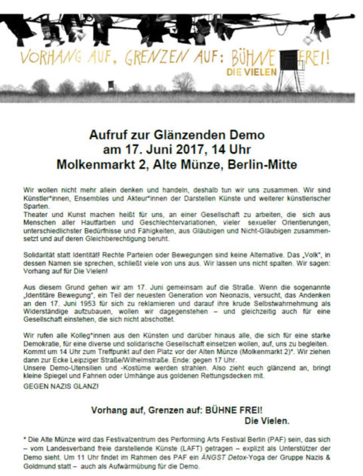Unter dem Motto "Vorhang auf, Grenzen auf: Bühne frei! Die Vielen" soll ein Happening gegen den Hass gefeiert werden und alle Teilnehmer*innen sollen glänzen. Die Vielen und Berlin gegen Nazis laden alle Berliner_innen ein sich an der Mitmach-Aktion der Demonstration zu beteiligen. "Unsere Demo-Utensilien und -Kostüme werden strahlen. Also zieht euch glänzend an, bringt kleine Spiegel und Fahnen oder Umhänge aus goldenen Rettungsdecken mit. GEGEN NAZIS GLANZ!"