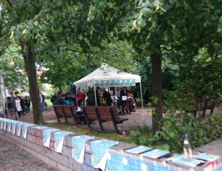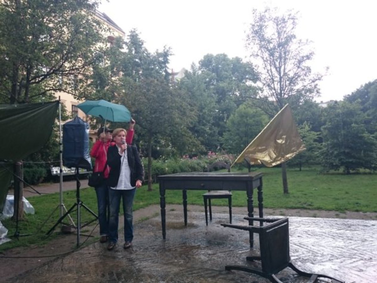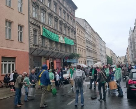 Obwohl die Anwohner_innen in der Spandauer Vorstadt nicht mehr direkt vom Aufmarsch betroffen waren, fanden die Kundgebungen sehr erfolgreich statt und dies trotz der sehr schlechten Wetterverhältnisse. Insgesamt beteiligten sich etwas vierhundert Menschen an den Kundgebungen, um ein klares Zeichen gegen Rechtsextremismus zu setzen. Die Nachbarschaft, viele in Begleitung ihrer Kinder, stand gemeinsam im Kiez gegen Rechtsextremismus auf. Eine tolle solidarische Stimmung wurde umrahmt von einem vielfältigen Programm mit Trommeln und Couchsurfing in der Ackerstraße, Chorgesang und dem Vortrag von Lebensgeschichten im Nationalsozialismus deportierter jüdischer Anwohner_innen auf dem Koppenplatz, bishin zu literarischem und musikalischen Programm auf der Kundgebung Gipsstraße/Augustraße. Auf der Kundgebung des Berliner Bündnis für ein weltoffenes und tolerantes Berlin am Monbijouplatz sprachen Verteter_innen vom DGB, der evangelischen Kirche, der AWO-Mitte und vom Türkischen Bund Berlin Brandenburg - TBB. Auf den Anwohner_innenkundgebungen sprachen die Bundestagsvizepräsidentin Petra Pau (Die Linke) und die Politiker_innen aus dem Bezirk Mitte Eva Högl (MdB/SPD), Özcan Mutlu (MdB/ Bündnis 90/Die Grünen) und Frau Jasper-Winter (MdA /FDP).