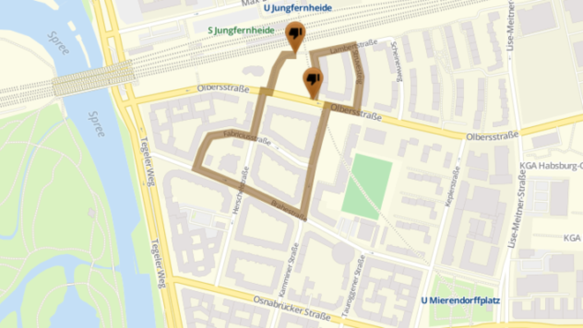 Voraussichtliche Route Bärgida-Aufmarsch ab ca. 19.30 Uhr, Startpunkt: S/U Jungfernheide – Olbersstraße – Herscheltraße – Fabriciusstraße – Brahestraße – Kamminerstraße – Olbersstraße – Struvesteig – Lambertstraße – Gallesteig Endpunkt: Gallesteig/Olberstraße