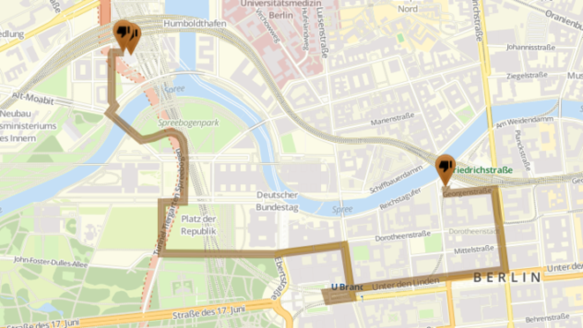 Voraussichtliche Route des Bärgida-Aufmarsch ab ca. 19.15 Uhr, Startpunkt: Dorothea-Schlegel-Platz - Georgenstr. - Friedrichstr. - Unter den Linden - Pariser Platz - Unter den Linden - Wilhelmstr. - Dorotheenstr. - Scheidemannstr. - Heinrich-von-Gargern-Str. - Paul-Löbe-Allee - Willy-Brandt-Str. - Rahel-Hirsch-Str. - Ella-Trebe-Str. - Endpunkt: Washingtonplatz