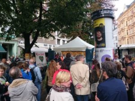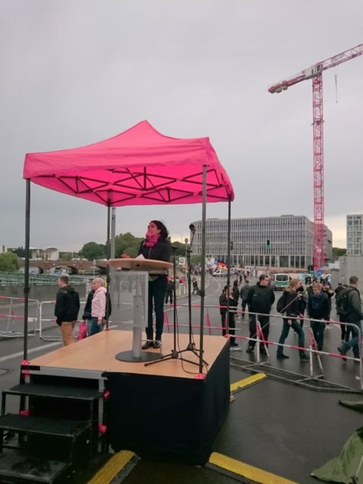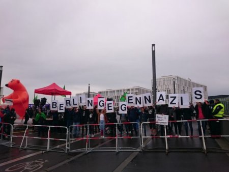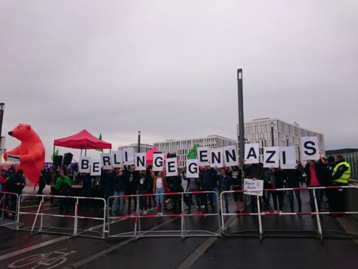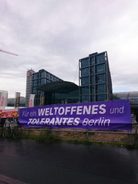 Das Bündnis für ein weltoffenes und tolerantes Berlin, ein großes Bündnis von Kirchen, Gewerkschaften, Wohlfahrtsverbänden und weiteren zivilgesellschaftlichen Organisationen, richtete eine Kundgebung am Auftaktort des rechtsextremen Aufmarsches am Hauptbahnhof aus und gab den Berliner_innen die Möglichkeit direkten Protest gegen den Aufmarsch zu artikulieren. Es sprachen Redner_innen von Bündnis, dem TBB, dem DGB, Bündnis 90/ die Grünen und der Anwohner_inneninitiative für Zivilcourage – Gegen Rechts aus Mitte.