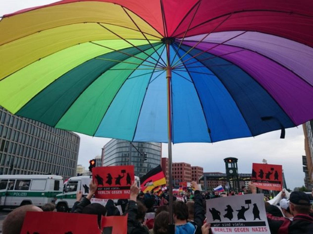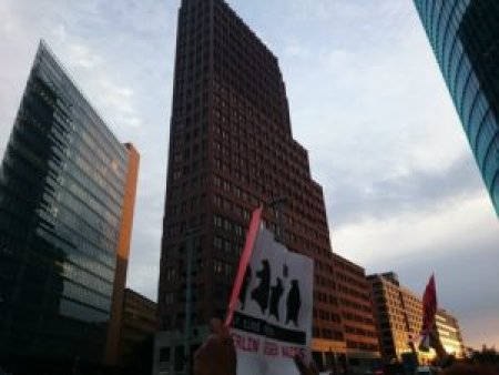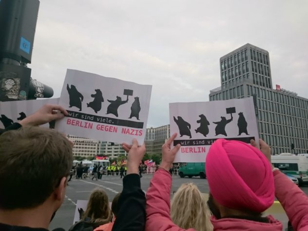 Am Endpunkt des rechtsextremen Aufmarsches am Potsdamer Platz empfingen noch einmal hunderte Berliner_innen auf einer Kundgebung des Berliner Bündnis gegen Rechts, einem Zusammenschluss von Vereinen, Verbänden und linken sowie antifaschistischen Gruppen, lautstark und bunt die Rechtsextremen. Viele Berliner_innen nutzen hier die „Berlin gegen Nazis“-Klatschpappen um ihren Protest auszudrücken.