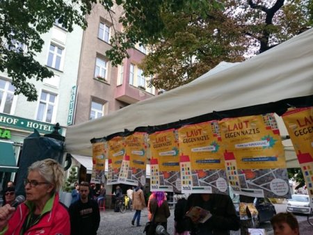 Berlin gegen Nazis bot auf dieser Kundgebung am „Berlin gegen Nazis-Aufblasbär zwei Mitmach-Aktion für alle Berliner_innen an. Während das „Plakate malen gegen Neonazis“ leider ins Wasser fiel, es regnete stark, konnte mit einer Buchstabenchoreografie ein deutliches Zeichen gegen die Rechstextremisten gesetzt werden, die es auch in die überregionale Presse schaffte.