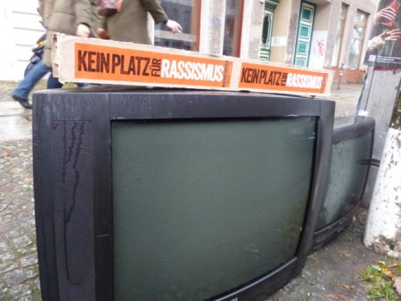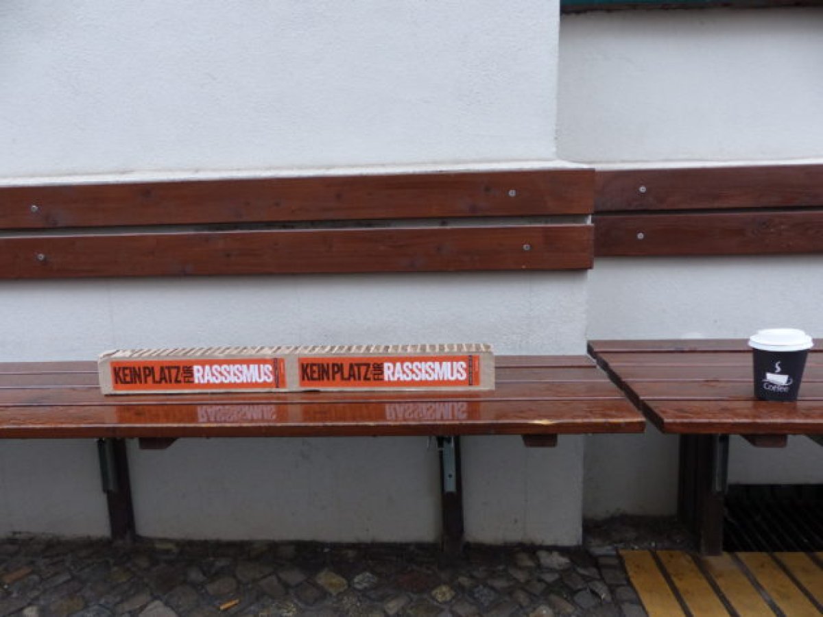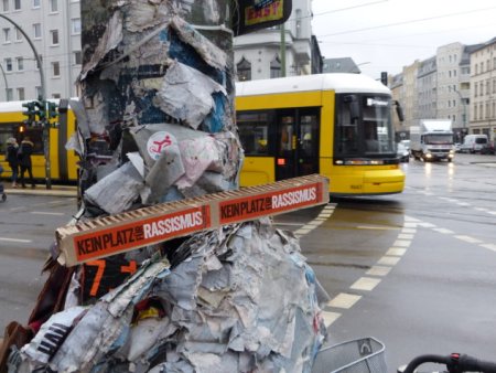 Hinweis: Ende der Aktion März 2018 Wo ist kein Platz für Rassismus? Das kann von nun an mit den neuen Stickern von Berlin gegen Nazis gezeigt werden, die vom Netzwerk-Partner Super an der Spree, einer Berliner Kommunikationsagentur, entwickelt wurden. Die Aufkleber können ab sofort per Mail mit Angabe der Versandadress bei info@berlin-gegen-nazis.de bestellt werden (bitte nur Bestellungen aus Berlin). Nach dem Zufallsprinzip legen wir einen Stoffbeutel aus unserem Restposten bei – gestaltet von Super an der Spree und produziert mit Unterstützung unseres Partners Blackstar. Das Ganze läuft natürlich nur, solange der Vorrat reicht! Wir freuen uns, wenn Fotos der Aufkleber dann auf Instagram unter dem Hashtag #keinplatzfürrassismus und #berlingegennazis gepostet werden, denn Berlin gegen Nazis ist auch auf Instagram präsent: www.instagram.com/berlingegennazis. Wer sich in 2018 darüber hinaus engagieren möchte, kann dies spätsestens bei den Protesten gegen den nächsten rechtsextremen Aufmarsch in Berin-Mitte am 03.März 2018 oder im Rahmen der Aktionswochen vom 12. - 25. März aus Anlass des Internationalen Tages gegen Rassismus am 21. März 2018. Hier die ersten Sticker-Fotos: Fotos: Berlin gegen Nazis Hinweis: Bitte die Sticker nicht an Stellen verkleben, an denen dies nicht erlaubt ist.