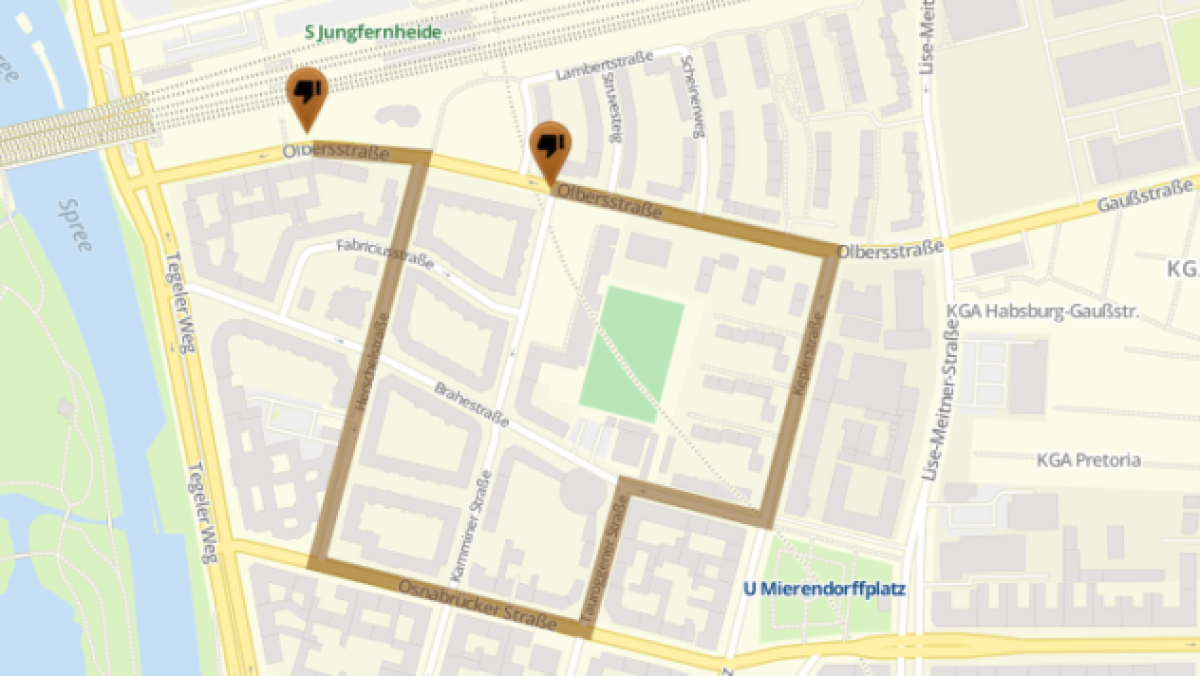 Voraussichtliche Route Bärgida-Aufmarsch ab ca. 19.00 Uhr, Startpunkt: S/U Jungfernheide – Olbersstraße – Herscheltraße – Osnabrücker Straße - Trauroggener Straße – Brahestraße – Keplerstr. - Olbersstraße Endpunkt:Olberstraße/Kamminerstraße